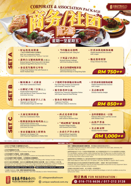 Elite Grand Ballroom is strategically located in Petaling Jaya, Selangor and it can accommodate up to 900 pax. The pillarless ballroom can be divided into three separate halls to accommodate various kind of function and seating capacity. The ballroom is suitable for wedding reception, company event, association & society function, seminars, conference, gala dinners, social gatherings and spectacular launches. Spacious lobby for reception and cocktail session purposes. Besides, we also provide VIP parking space and we also have designated parking area for ballroom guests; which can accommodate up to 700 cars and we do provide valet parking service for our guests convenience. Furthermore, we also provide dressing rooms and built-in washrooms for guests’ ease and convenience. Our exclusive reception area for each ballroom and LED display panel. Our ballroom also has a grand elevated stage and large high definition LED backdrop at each ballroom and spectacular lighting system and state-of-the-art sound systems. Our professional banqueting team is always ready to serve our honour guests. In Elite, we can provide you with more comprehensive arrangements and professional advice to assist you in your banquet.